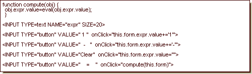 The Calculator is a simple html table containing buttons and a text box inside of a form . JavaScript makes it 'work'. Recall that there are two places where you see JavaScript code - in the heading as variables and functions, and in the body as JavaScript strings in event handlers. Here are a few lines from the Calculator code shown in isolation for clarity - the compute(obj) function, the text box, and the code for the one, minus, clear, and equal buttons: