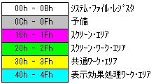 ![]() ![]() PIC16F84Aにはユーザが使用できるRAMファイル・レジスタが68バイトあります。 今回のソフトウェアでは以下のような使い方をしています。 スクリーンエリア[10h-1Fh] : LEDに表示するパターンをここに設定します。 スクリーンワークエリア[20h-2Fh] : 表示効果処理をするためのワークエリアです。 共通ワークエリア[30h-3Fh] : 共通処理で使用するワークエリアです。 表示効果処理ワークエリア[40h-4Fh] : 表示効果処理で使用するワークアリアです。 |