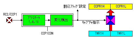 コンペア(比較)モードで内容の一致が発生するとトリガ信号によりタイマー1がリセットされます。 CCP2用のレジスタ(CCPR2)も8ビットのCCPR2LレジスタとCCPR2Hレジスタで構成されています。CCP2の動作はCCP2CONレジスタで制御することができます。 CCP2の場合、コンペアモードで内容の一致が発生するとトリガ信号によるタイマー1のリセット動作はCCP1と同じですが、CCP2ではさらにA/Dコンバータを使用している場合にはA/Dコンバータをスタートさせます。 以下の説明ではCCP1を対象に説明をします。CCP2での違いは説明の中で記載しています。 ![]() キャプチャモードではRC2/CCP1ピン(pin13)の変化が発生したときにタイマー1の内容をCCPR1レジスタ(CCPR1HとCCPR1L)に取り込みます。RC2/CCP1ピンはTRISCレジスタにより必ず入力モードに設定する必要があります。出力モードに設定した場合、出力データの条件がキャプチャ条件になります。 ![]()