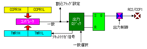 キャプチャモードを使用する場合、タイマー1は必ず同期式のタイマーモードで動作させる必要があります。非同期の場合にはキャプチャ機能は動作しません。キャプチャモードを解除するときには誤動作を防止するためにPIE1レジスタのCCP1IEビットおよびPIR1レジスタのCCP1IFビットをクリアする必要があります。 ![]() コンペアモードではCCPR1レジスタの内容とタイマー1(TMR1)の内容が常に比較されます。 ![]()