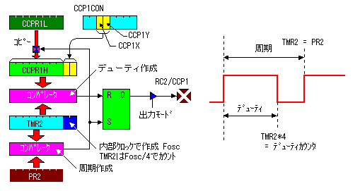 コンペアモードを使用する場合、タイマー1は必ず同期式のタイマーモードで動作させる必要があります。非同期の場合にはキャプチャ機能は動作しません。 ![]() PWM(Pulse Width Modulation)モードではCCP1(pin13)に連続的なパルス信号を出力することができます。 ![]()